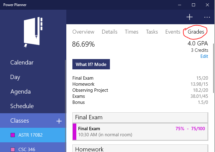 If your class weights grades into categories, like 30% homework, 60% exams, 10% participation, Power Planner supports that!